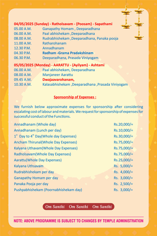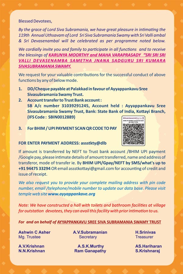 The Lord Sree Siva Subramania Swamy is known as “Varaprasadhi” and the prayers of his devotees are granted / fulfilled. We, the devotees of the Lord are the best examples of HIS memorable Grace / blessings.